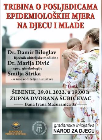 Građanska inicijativa Narod za djecu, sindikat Prosvjetitelj te Sindikat slobode, prava i jednakosti policijskih službenika organizirali su u Šibeniku tribinu o POSLJEDICAMA EPIDEMIOLOŠKIH MJERA NA DJECU.