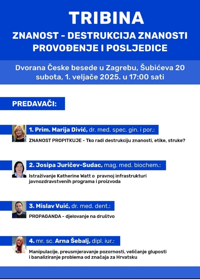 Pozivamo Vas na još jednu zanimljivu zagrebačku tribinu o sustavnom uništavanju znanosti i koje su posljedice tog dugogodišnjeg procesa. Predavači su naši poznati liječnici i stručnjaci te višegodišnji aktivisti u borbi protiv globalističke agende, a u obranu čovjeka i ljudskosti.