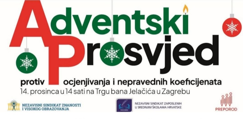 Znamo da je u subotu veliki tzv. Adventski prosvjed reprezentativnih prosvjetnih sindikata protiv ocjenjivanja učitelja i za veće koeficijente. Plakat je prigodno zaigran, okićen božićnim kuglicama i u prazničkim je bojama te izgleda poput još jedne adventske dekoracije na Zrinjevcu, fino se uklopio u božićni ugođaj.